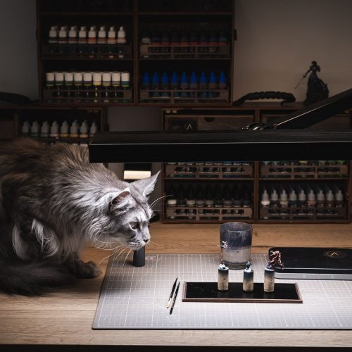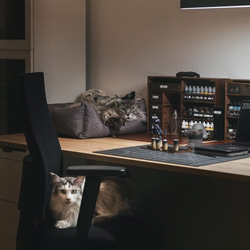– Yes they are both Coons – brother and sister. Both always need to get involved with what I’m doing. No matter if I’m painting, gaming, working, studying, or by far the most exciting thing cutting up cardboard boxes. Most of the time there is at least one cat either on my desk or somewhere in my room. They will ask for cuddles, demand to sit on my lap or carry their toy over so I play with them. It is tricky to keep all the tiny cat hairs away from my minis and I have to keep a close eye on my paint water, wet-palette and brushes. Sometimes half of my painting time ends up being „cat time“ but I wouldn’t want it any other way.