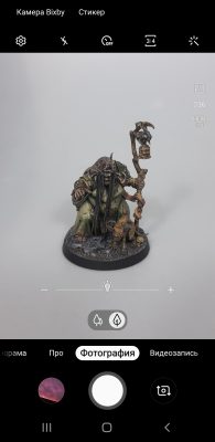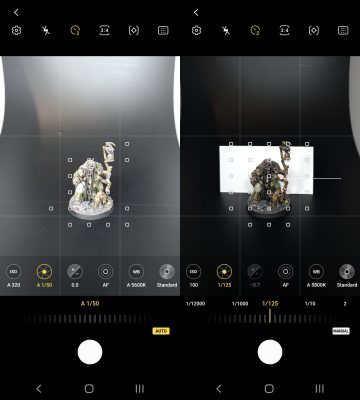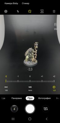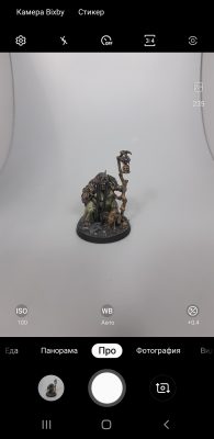 Pictures in auto and pro mode look very similar. However, default settings did a better job this time. If you look at the lower part of the model in pro mode, you can see that it’s slightly out of focus. The colors are bright. Both images can be adjusted in photoshop, but in the case of light background, default settings do a good enough job for miniature photography.